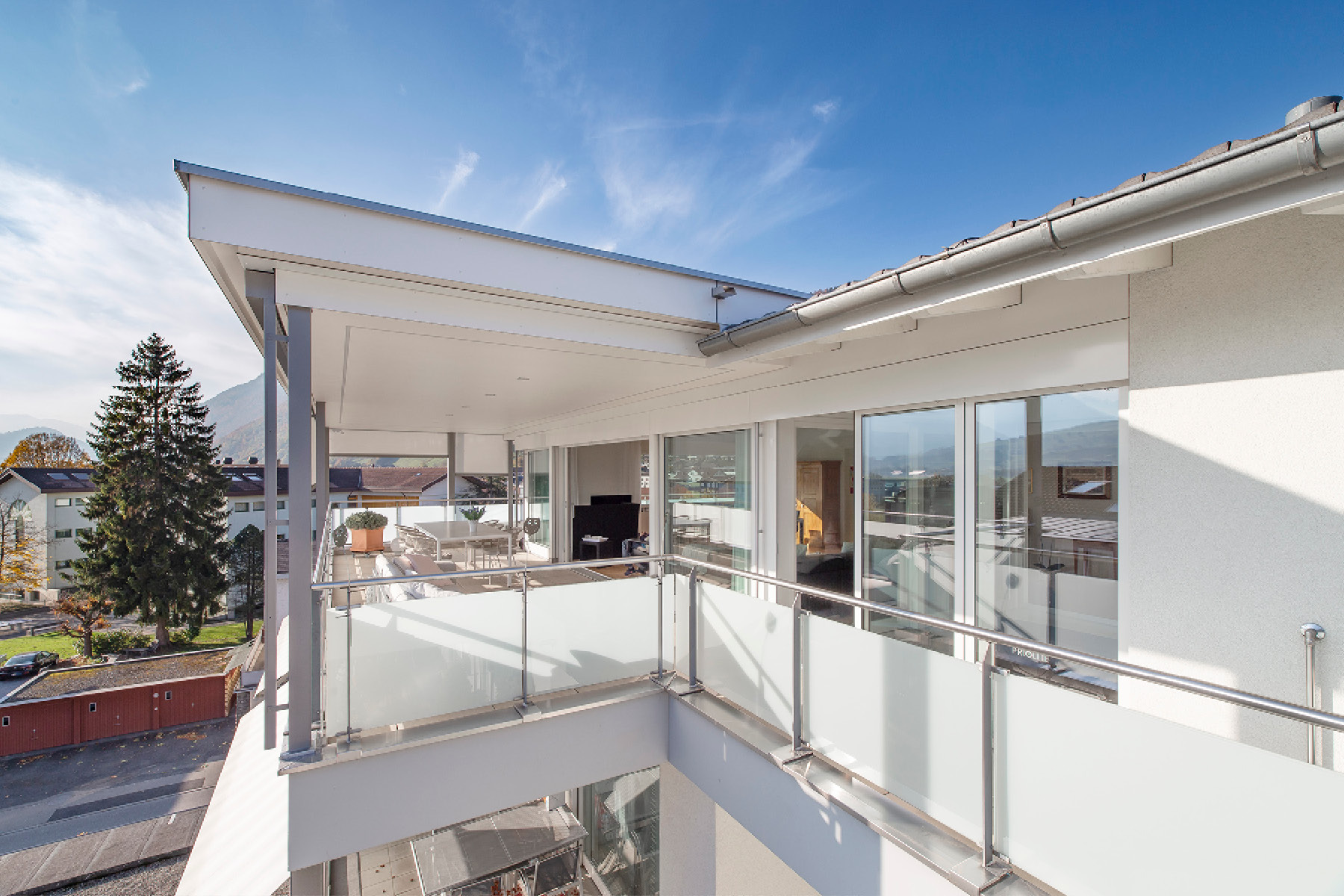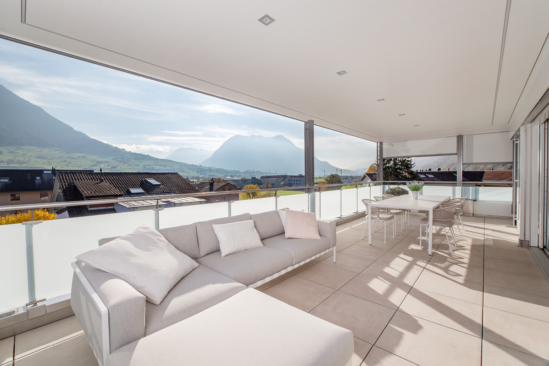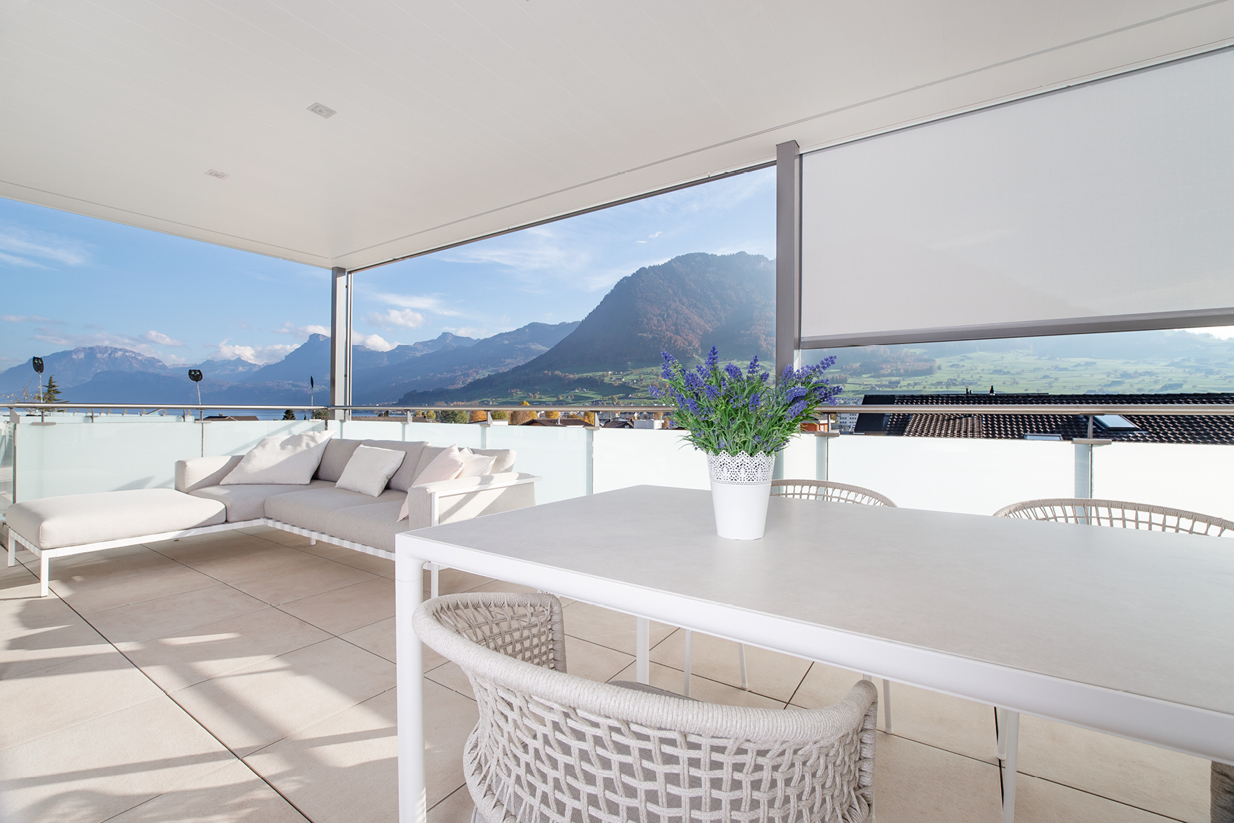 Die gedeckte Terrasse mit seitlichem Sonnen- und Witterungsschutz