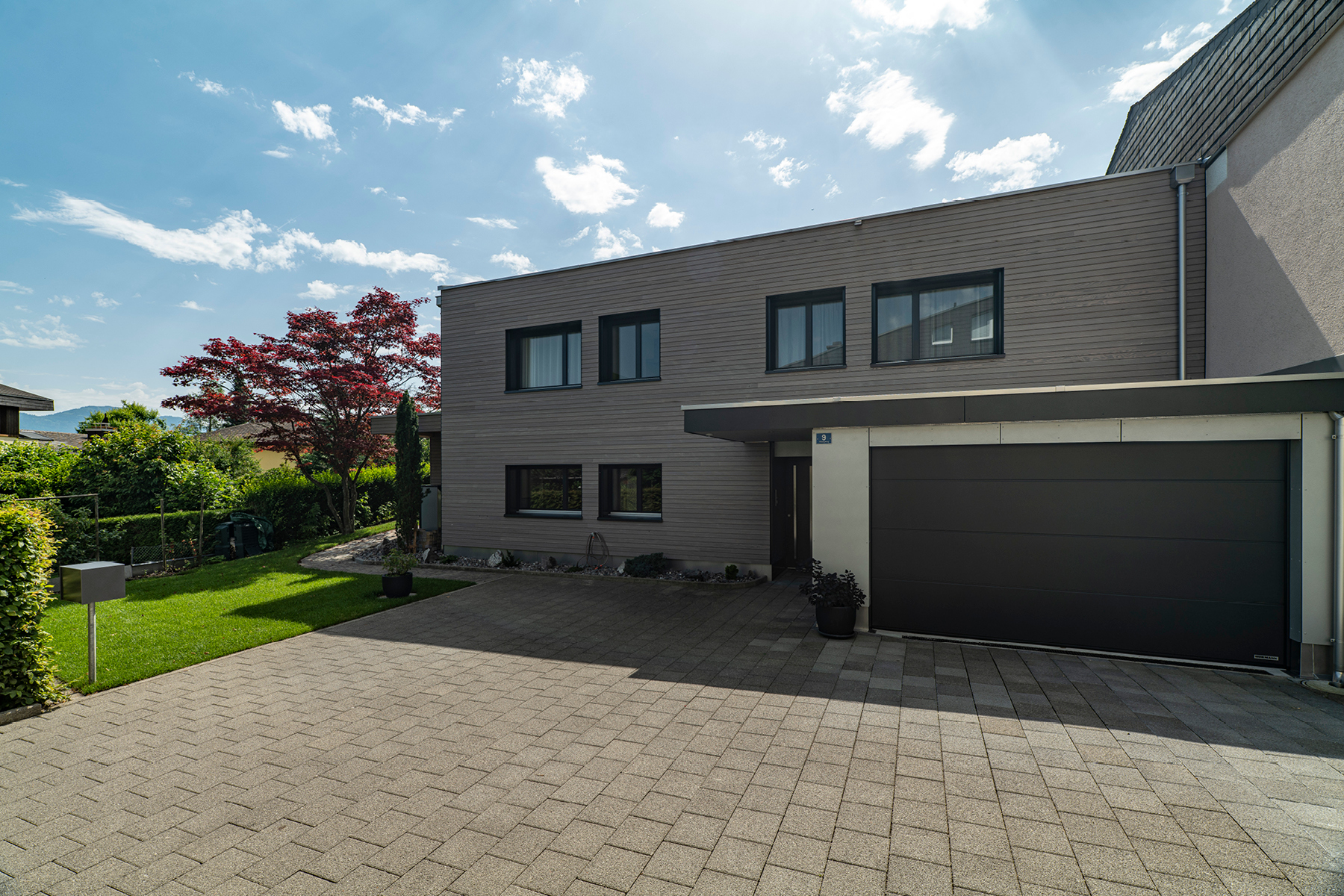 Mit der neu gestaltete Fassade in Holz- und Faserzement strahlt das Haus in neuem Glanz.